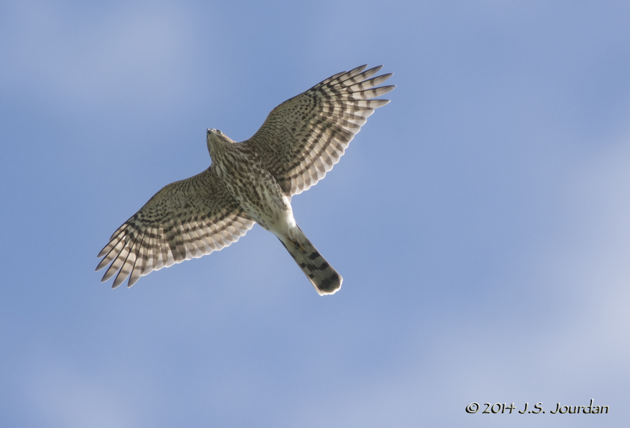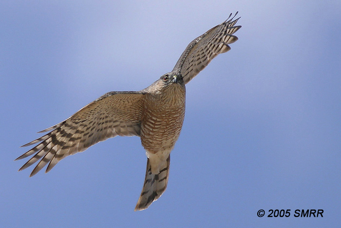 Sharp-shinned Hawks (Accipiter striatus) are one of the most commonly seen species in September when the majority of the species migrate through the area. Adult (left) and juvenile (right) are recognizable by their T-shaped, erratic wing-flap, and 'notched' shoulders.