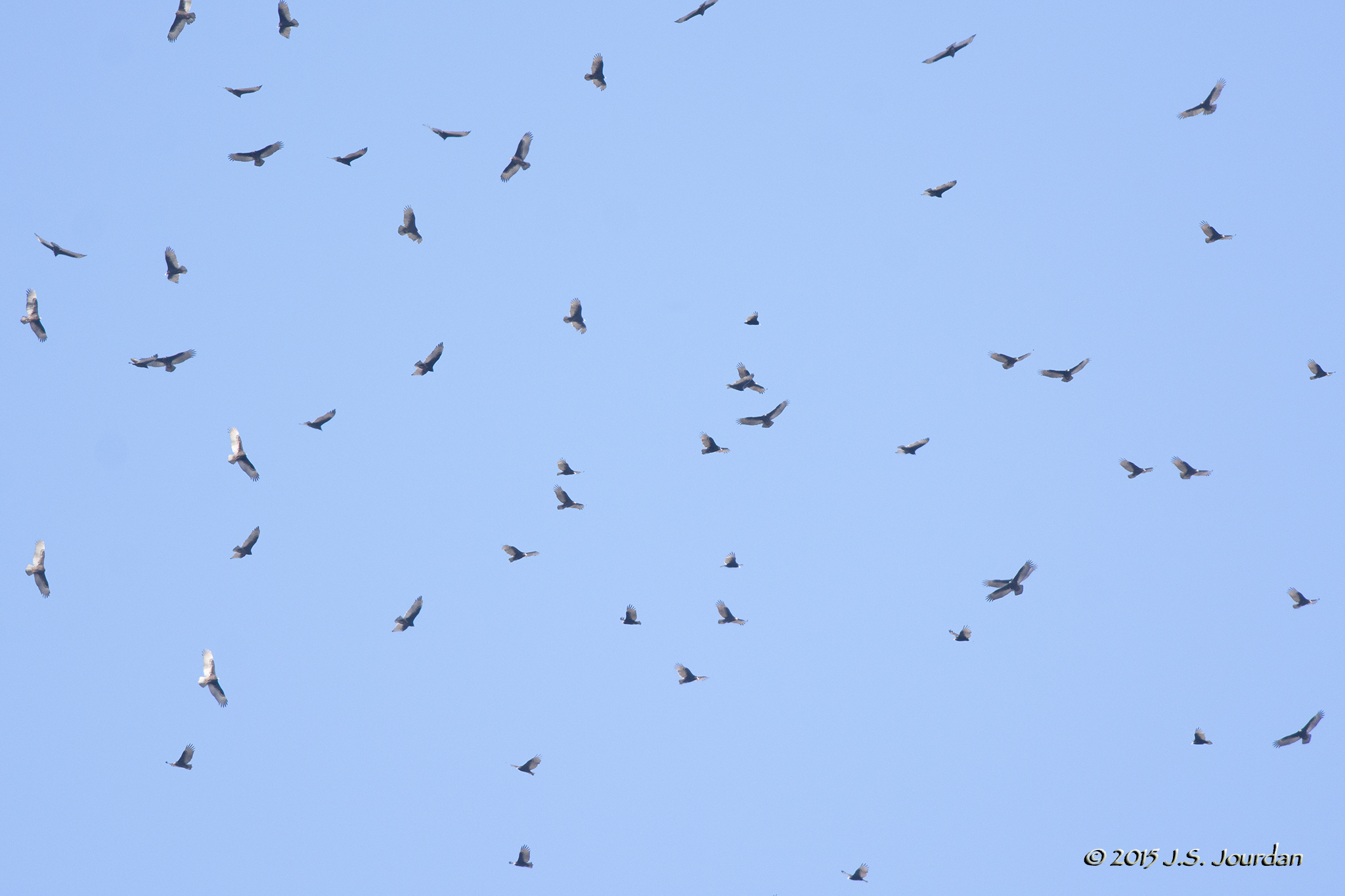 A "kettle" of Turkey Vultures (Cathartes aura) on an October day gathering in a thermal. Thousands of these birds can pass overhead on a daily basis during the month of October.